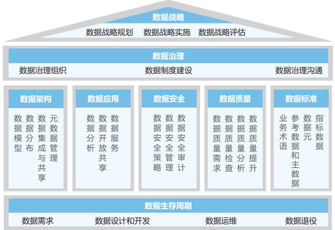 DCMM數(shù)據(jù)管理能力成熟度評(píng)估模型定義了數(shù)據(jù)戰(zhàn)略、數(shù)據(jù)治理、數(shù)據(jù)架構(gòu)、數(shù)據(jù)應(yīng)用、數(shù)據(jù)安全、數(shù)據(jù)質(zhì)量、數(shù)據(jù)標(biāo)準(zhǔn)和數(shù)據(jù)生存周期八個(gè)核心能力域及28個(gè)能力項(xiàng)445條標(biāo)準(zhǔn)進(jìn)行評(píng)估。